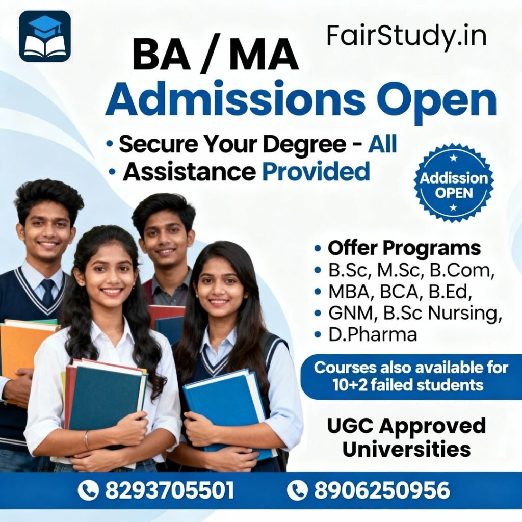 Are you aspiring for a graduation degree but facing hurdles in your studies? At FairStudy.in, we believe every student deserves a chance at higher education, regardless of past results. Secure your future with our admissions open for BA, MA, B.Sc, M.Sc, B.Com, MBA, BCA, B.Ed, GNM, B.Sc Nursing, and D.Pharma programs.